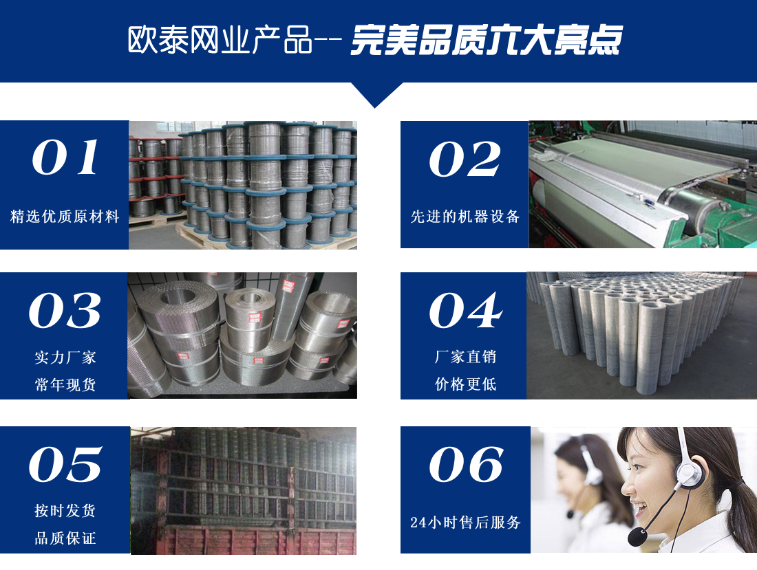 河北省安平縣歐泰五金網業有限公司座落于聞名全國的絲網之鄉河北省安平縣,是一家集科研,生產, 經營,銷售為一體的綜合性企業。我廠技術力量雄厚,采用優質原材料,嚴把質量關,主要絲網產品:編織系列:不銹鋼 絲網,鐵絲網,電鍍鋅鐵絲網,熱鍍鋅鐵絲網,包塑鐵絲網,窗紗,,輸送網,合股網,勾花網,六角網,石籠網,銀絲,銀網。護 欄網:護攔網、公路護欄網,鐵路護欄網,機場護欄網,工廠防護網,小區防護網,電焊網,電焊網片,聚脂網系列:聚脂成型 網、聚脂單絲干網、印刷網。金屬板網:鋼板網、鎳板網,鋁板網,沖孔網主要應用于工業,石油,化工,建筑,紡織,醫 藥,航天,航空,養殖,冶金機械等多個領域,我廠技術力量雄厚,設備先進,檢測方法齊全,產品質量穩定....